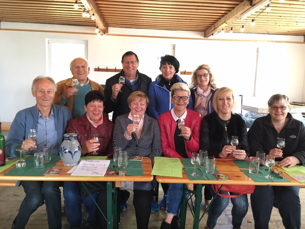 Über Wein darf man natürlich nicht nur reden. Die Gäste waren eingeladen vier Weinsorten in den schön geformten Gläschen zu probieren, zu schwenken, zu riechen, zu schlürfen, den Gaumen mit dem Wein zu tapezieren und schließlich genüsslich durch die Kehle rinnen zu lassen. Der süße Federweiße fand Gefallen. Der Spätburgunder war mit 5 g Restzucker dagegen sehr trocken. Der Riesling Rothenack mit einem Restzucker von 16 g wird mit „halbtrocken“ beschrieben. Rothenack Riesling Spätlese schmeck bei einem Restzucker von 42 g in der Tat „lieblich“.