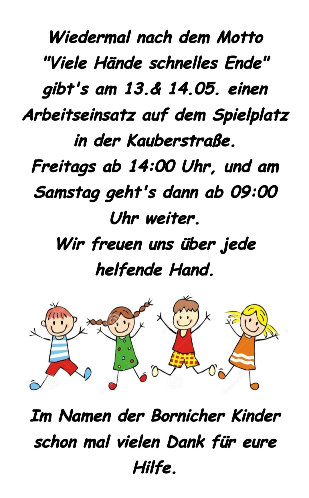 Wiedermal nach dem Motto „Viele Hände schnelles Ende“ gibt’s am 13. & 14.05. einen Arbeitseinsatz auf dem Spielplatz in der Kauber Straße.